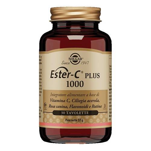 Ester-C PLUS 1000Descrizione Integratore alimentare a base di Ester-C, una vitamina C caratterizzata da un'elevata biodisponibilità e a pH tamponato (non acido) ben tollerata a livello gastrointestinale. La formulazione combina Rosa canina, estratto secco di bacche di Ciliegia acerola, bioflavonoidi e rutina. La vitamina C contribuisce alla normale funzione del sistema immunitario e alla protezione delle cellule dallo stress ossidativo. Sostiene il normale funzionamento del sistema nervoso e contribuisce a ridurre la stanchezza e affaticamento. Inoltre la vitamina C accresce l'assorbimento del ferro e favorisce la formazione del collagene...