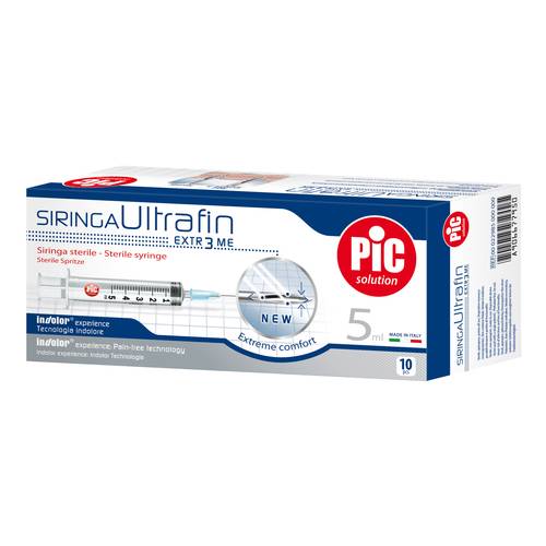 PIC solutionSIRINGA Ultrafin Dispositivo Medico. Siringa con triplice affilature estremizzata che garantisce una penetrazione più facile e un'elevata capacità di flusso per un'iniezione ancora più indolore, pratica e sicura. Sterile, apirogena, pronta all'uso. Dispositivo monouso. Indolor experience: l'esclusiva tecnologia di Pic. Comfort estremo. Ago gauge 23x11/4 - 0,6x30 mm. Capacità: 5 ml. Non contiene ftalati e latex. Conservazione Conservare a temperatura ambiente, in luogo asciutto, lontano da sostanze chimiche e al riparo dalla luce solare diretta. Formato 10 pezzi. Cod. 0202298500000
